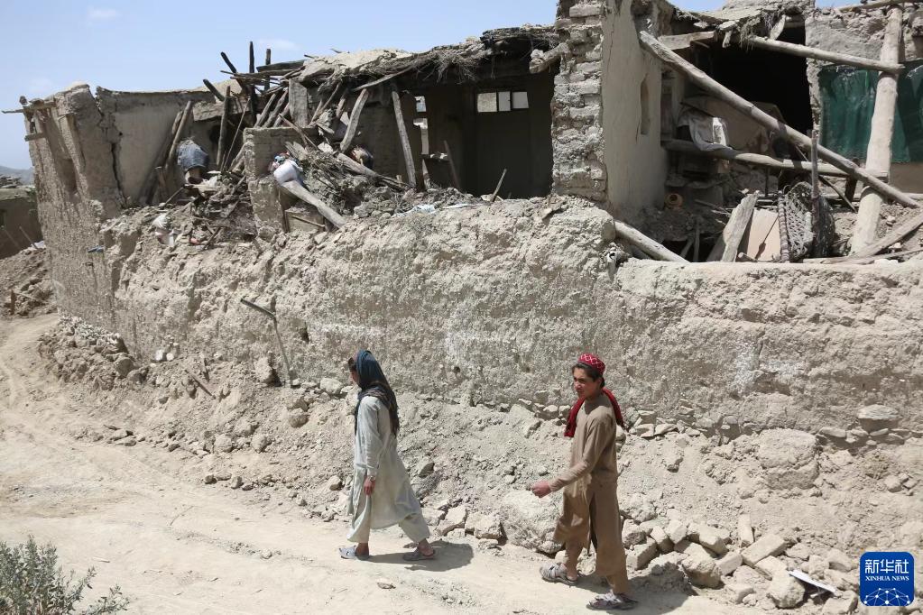 6月23日,在阿富汗帕克提卡省一座村庄,人们经过地震损坏的房屋。