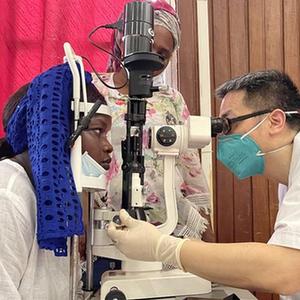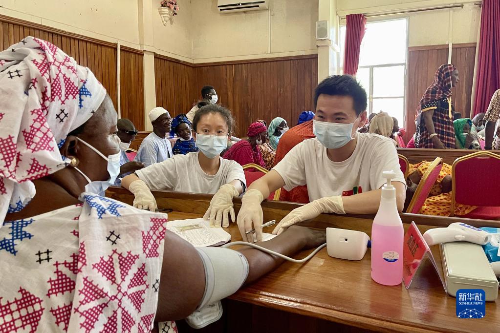 6月23日,在塞内加尔坦巴昆达大区议会大楼会议厅,中国医生为病人进行诊疗。
