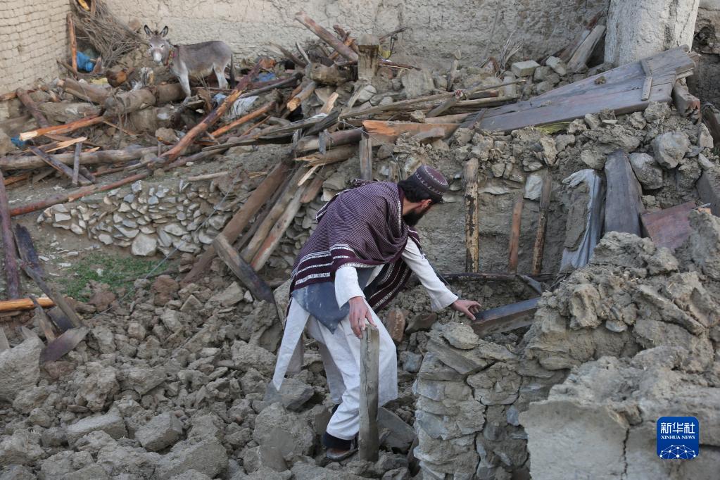 6月23日,一名男子站在阿富汗帕克提卡省地震灾区的房屋废墟中。