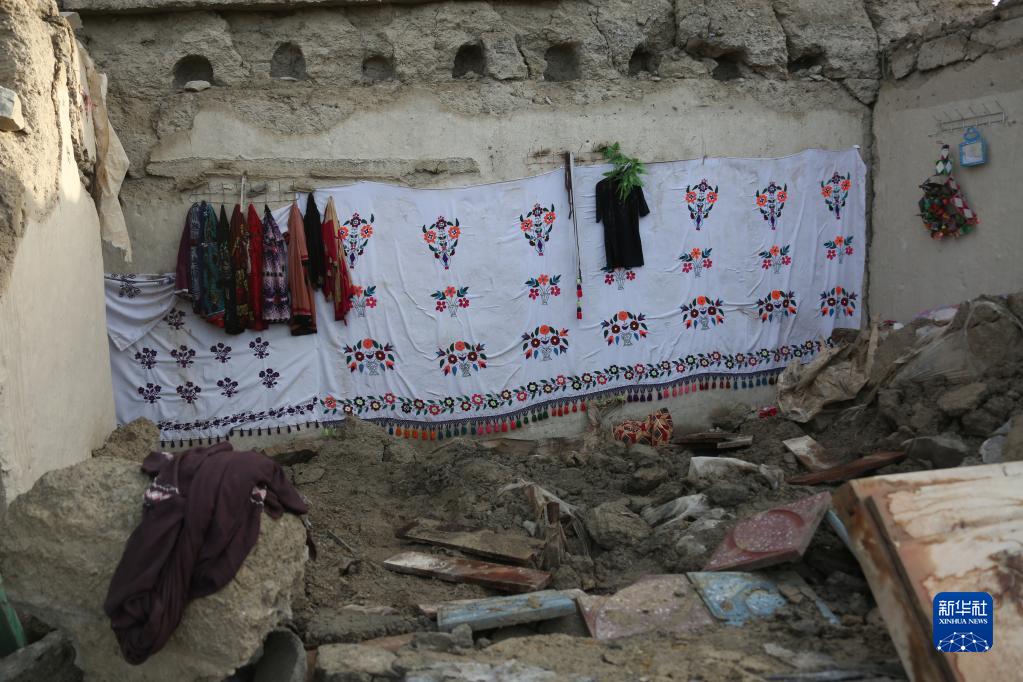 这是6月23日在阿富汗帕克提卡省拍摄的地震灾区的房屋废墟和居民衣物。