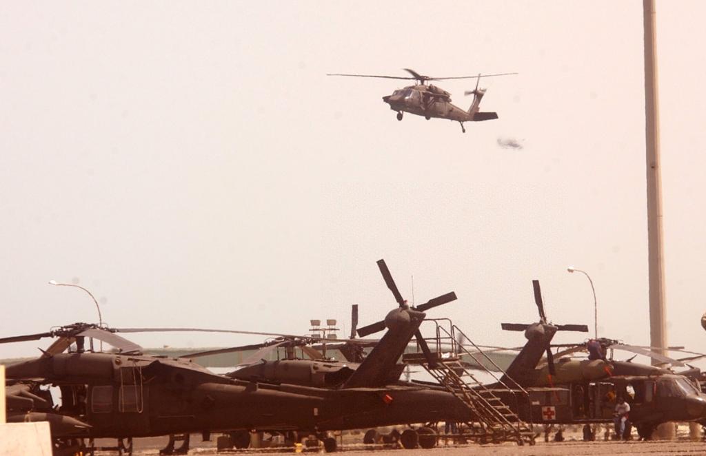 这是2003年4月14日,几十架抵达科威特的美军“黑鹰”及“阿帕奇”武装直升机准备从科威特城港口起飞,增援伊拉克前线。新华社记者 李晓果 摄