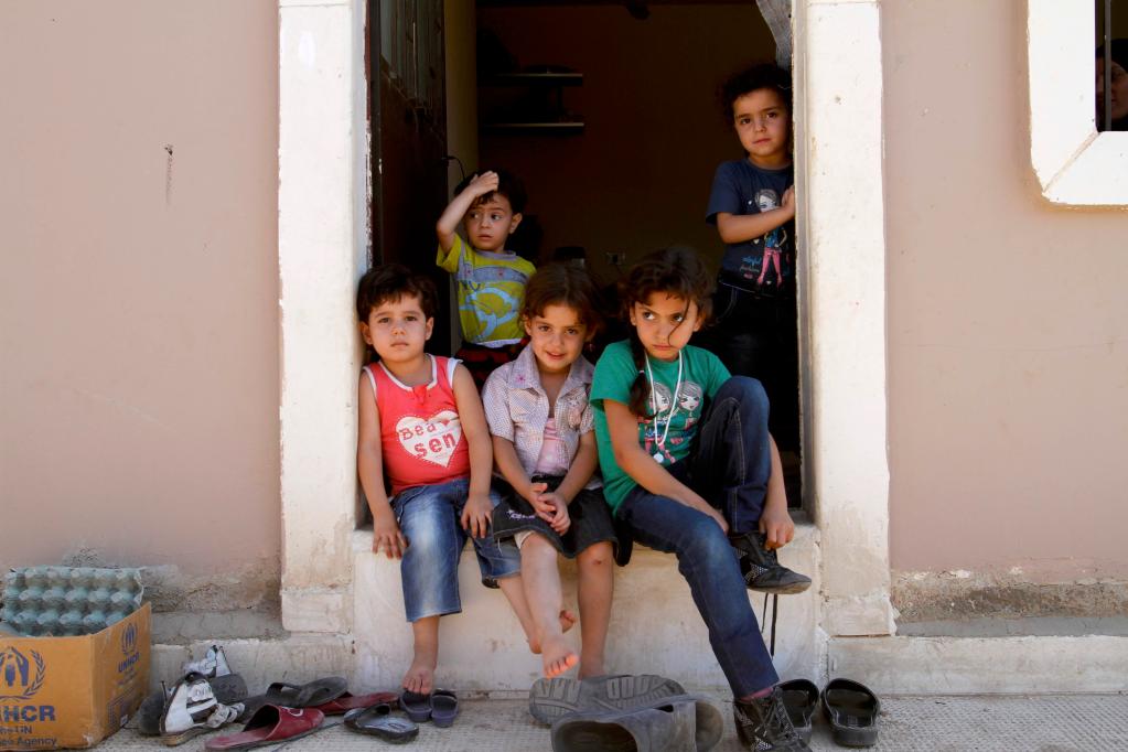 2016年9月1日,在叙利亚首都大马士革南郊的哈尔杰莱难民营,几名叙利亚儿童坐在门前。新华社记者 杨臻 摄