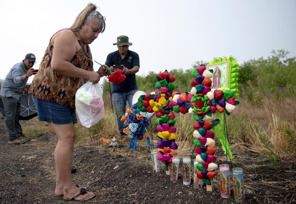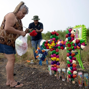 6月28日,一名女子在美国得克萨斯州圣安东尼奥市货车惨案现场摆放塑料花束。新华社发(尼克·瓦格纳 摄)