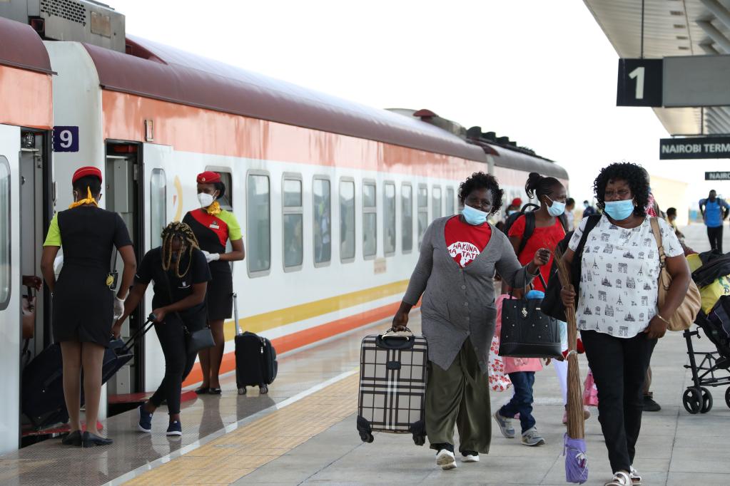 2021年11月17日,在肯尼亚蒙内铁路内罗毕站,乘客从始发于蒙巴萨的客运列车上下车。(新华社记者 董江辉 摄)