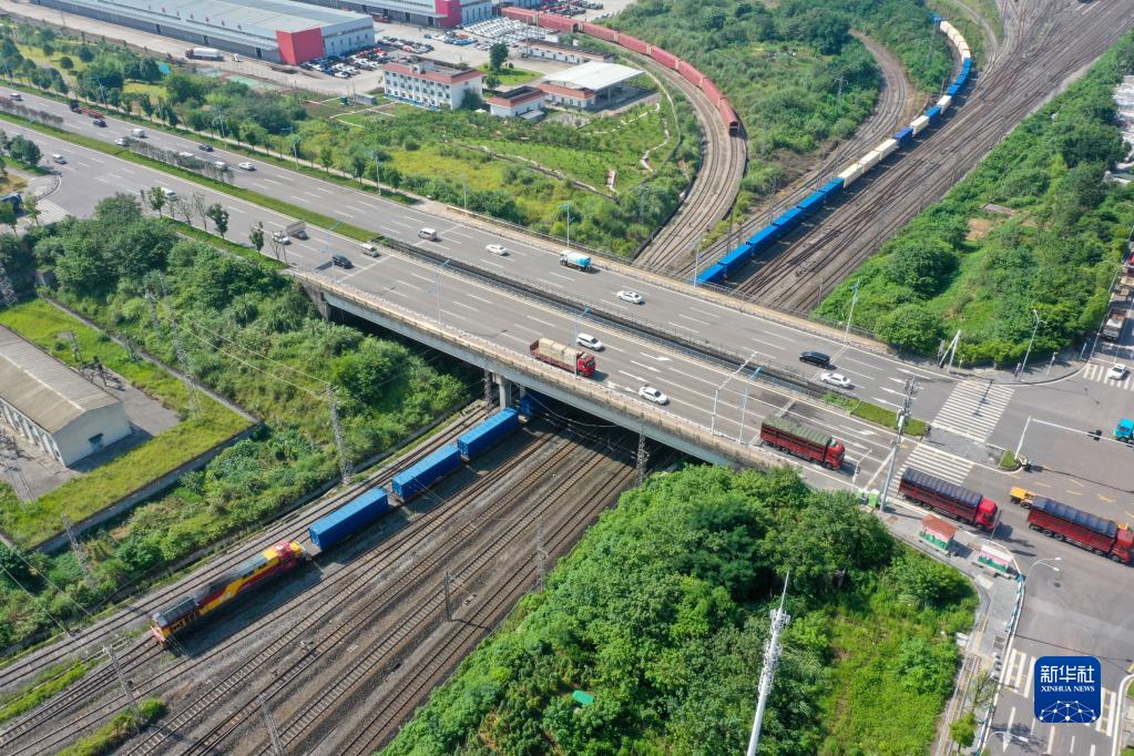 6月30日,中欧班列(成渝)从一座公路桥下穿过(无人机照片)。新华社记者 唐奕 摄