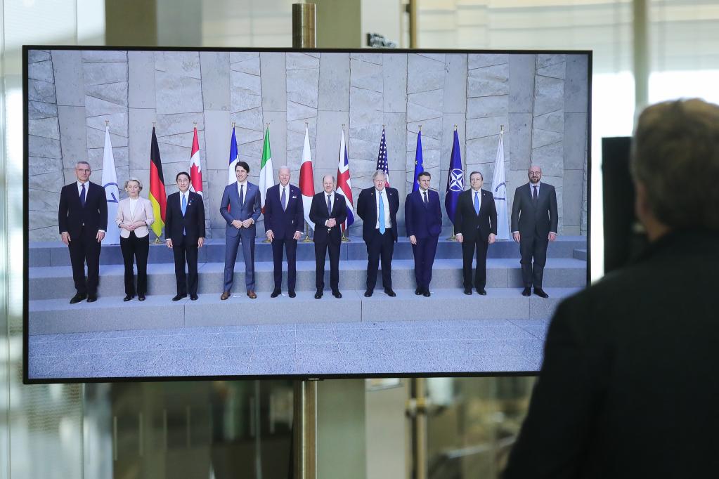 3月24日,在比利时布鲁塞尔北约总部,一名男子观看屏幕上七国集团峰会领导人合影的画面。(新华社记者郑焕松摄)