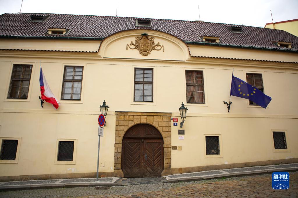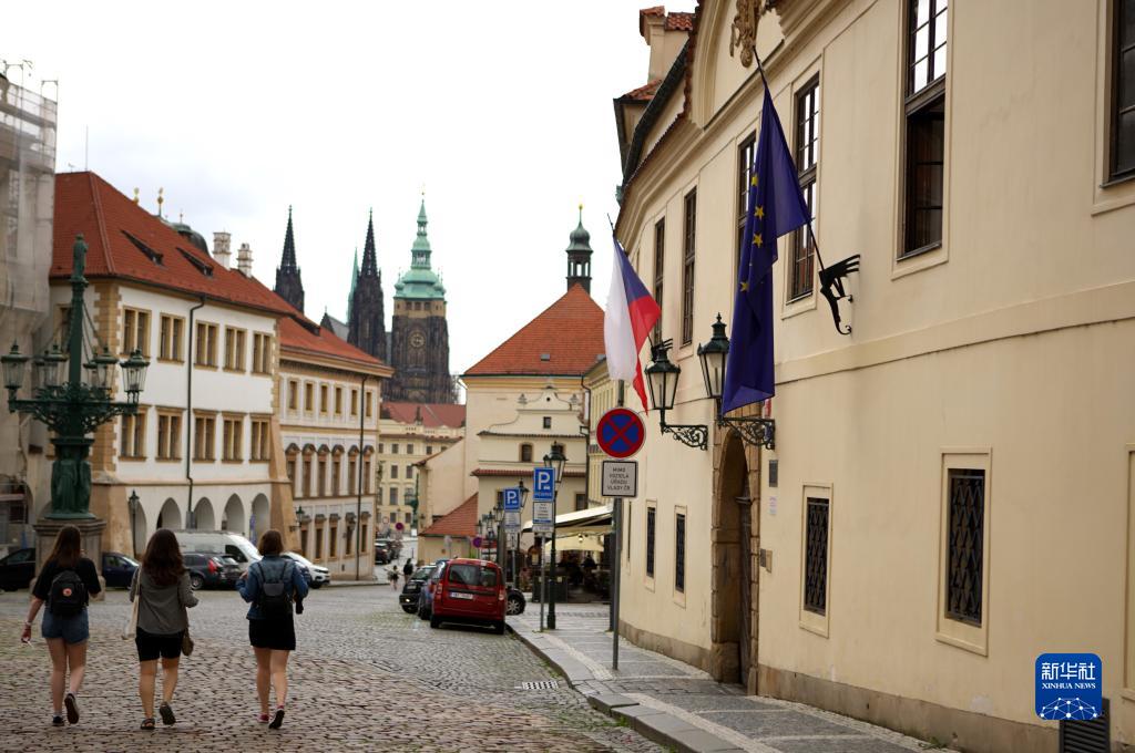 7月1日,捷克首都布拉格一处政府办公楼外悬挂捷克国旗和欧盟旗帜。新华社发(达娜·科什奈洛娃摄)