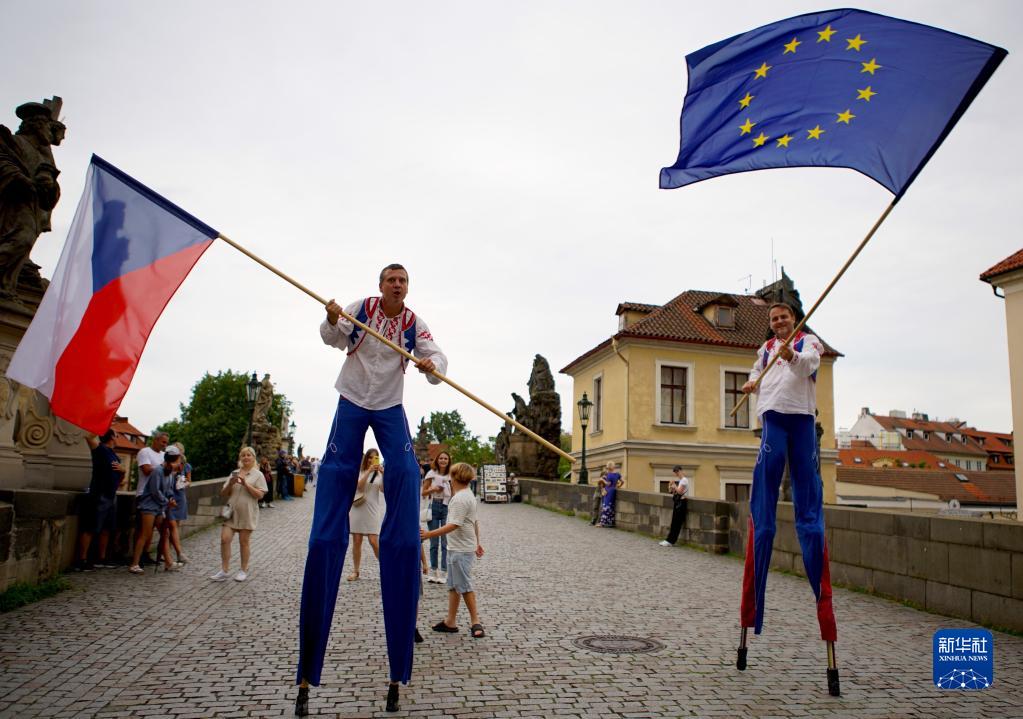7月1日,人们在捷克首都布拉格老城区挥舞捷克国旗和欧盟旗帜。新华社发(达娜·科什奈洛娃摄)