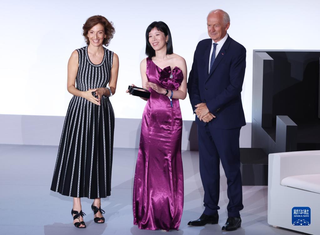 6月23日,在位于法国巴黎的联合国教科文总部,胡海岚(中)获颁“世界杰出女科学家奖”。