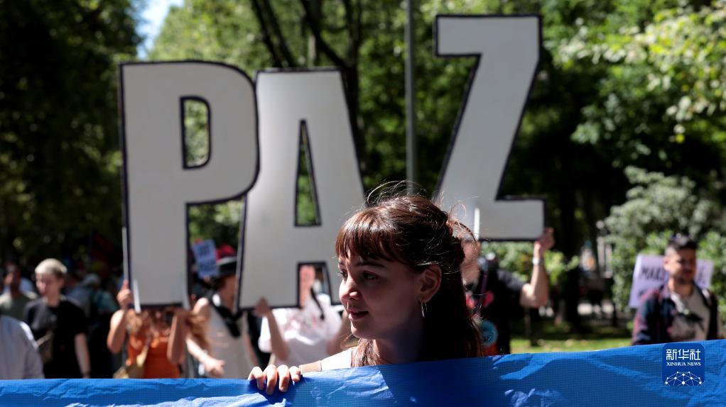 数千人6月26日在西班牙首都马德里市中心参加反对北约、呼吁世界和平大游行。