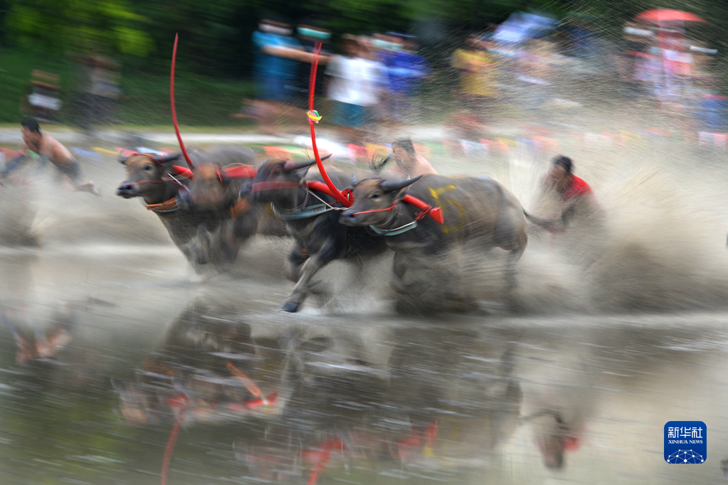 6月26日,参赛者在泰国春武里府驾驭水牛参加比赛。