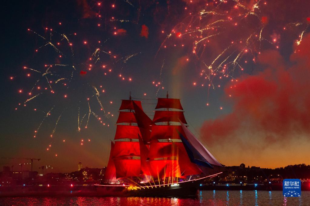 6月24日晚至25日凌晨,俄罗斯圣彼得堡欢庆一年一度的“红帆节”,庆祝中学生们毕业,走向人生新的起点。“红帆节”得名于俄罗斯作家格林创作于1923年的作品《红帆》。《红帆》讲述了一个富有传奇色彩的浪漫爱情故事,鼓励人们对生活充满希望,用自己的双手以及真诚和信念去创造奇迹。
