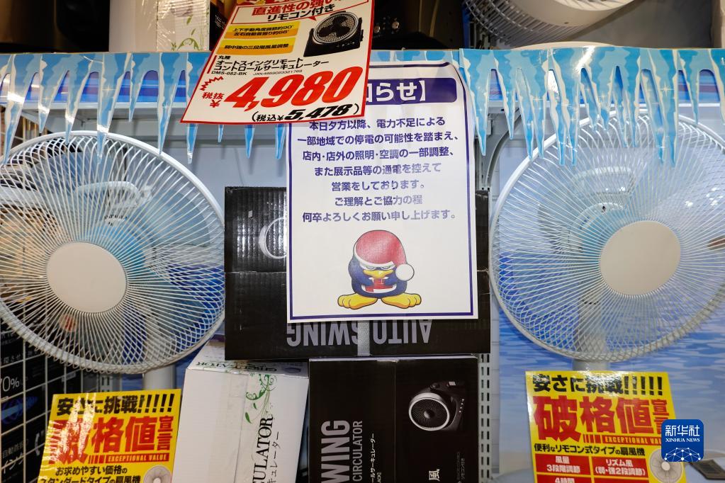 这是7月2日在日本东京目黑区一家超市拍摄的节电通知和风扇样品。