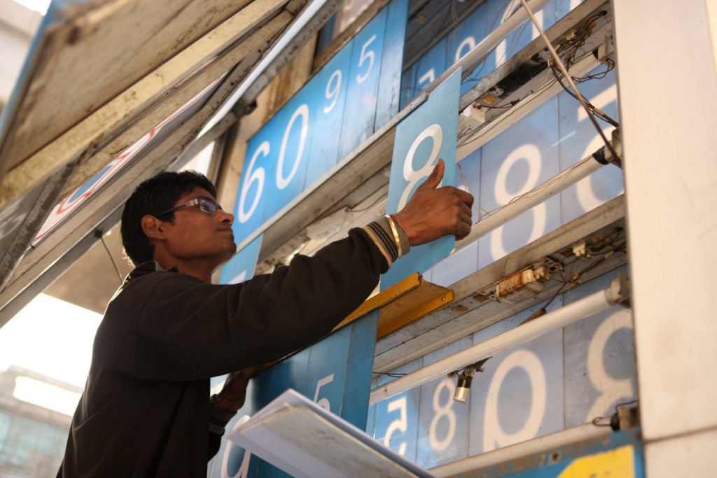 2011年1月16日,印度首都新德里一家加油站的员工在更新价格。新华社记者李毅刚摄