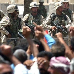 这是2003年6月18日,美军士兵在伊拉克首都巴格达美英联军临时总部门前持枪面对数百名示威的伊拉克人。新华社记者赵建伟摄