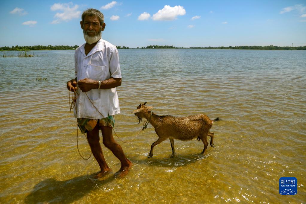 7月3日,在孟加拉国苏纳姆甘杰,一名男子牵着羊撤离遭遇洪水的村庄。