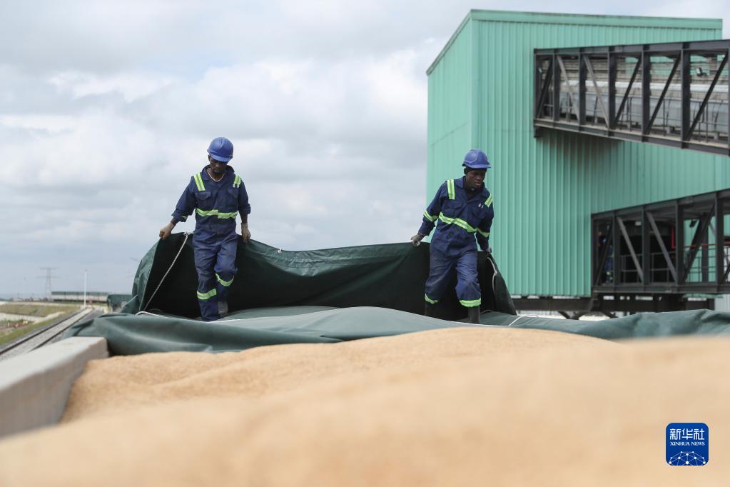 2022年5月18日,在肯尼亚内罗毕,蒙内铁路GBHL散粮装运专线的工人将粮食上覆盖的防水布揭开。