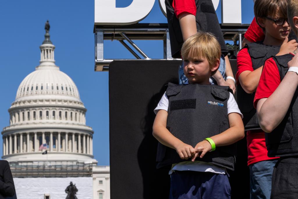6月6日,学生们身穿防弹衣在美国华盛顿的国会大厦前参加名为“不要回避”的抗议活动,呼吁立法机构正视美国枪击案频发的社会问题,要求加强枪支管控立法。新华社发(亚伦摄)