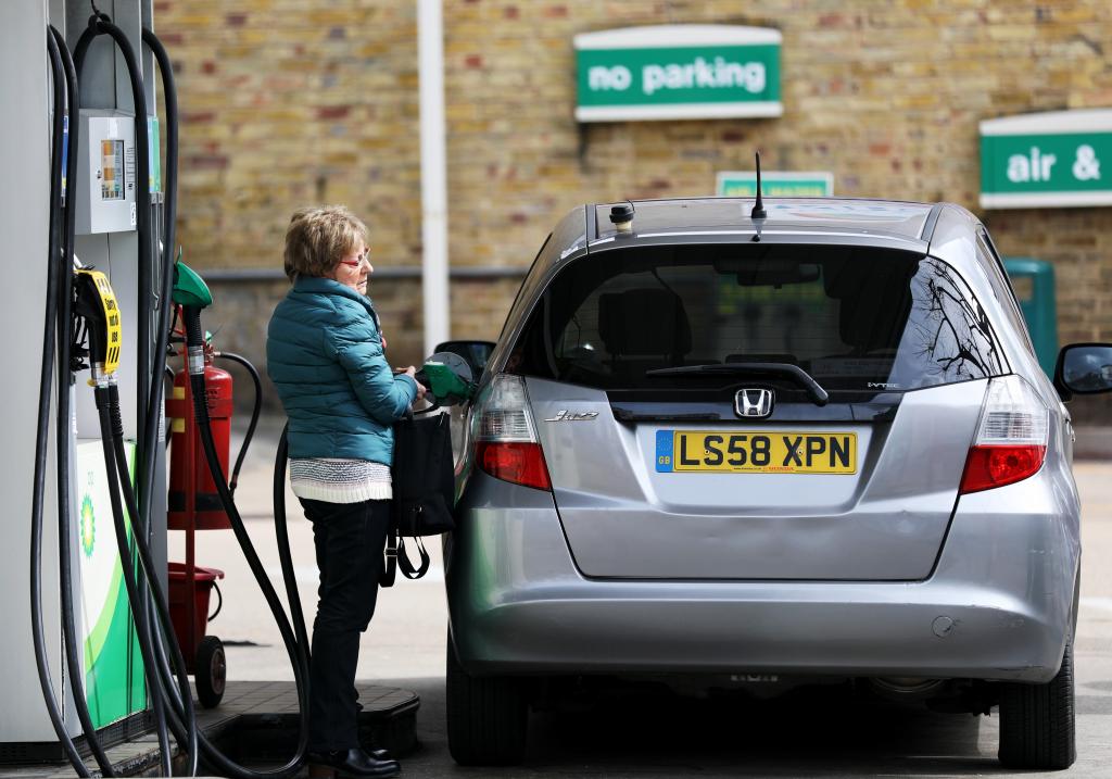 4月8日,一名女子在英国伦敦一处加油站加油。(新华社记者李颖摄)