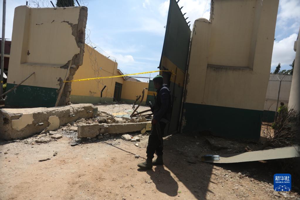 这是7月6日在尼日利亚首都阿布贾拍摄的遭毁坏的监狱大门。