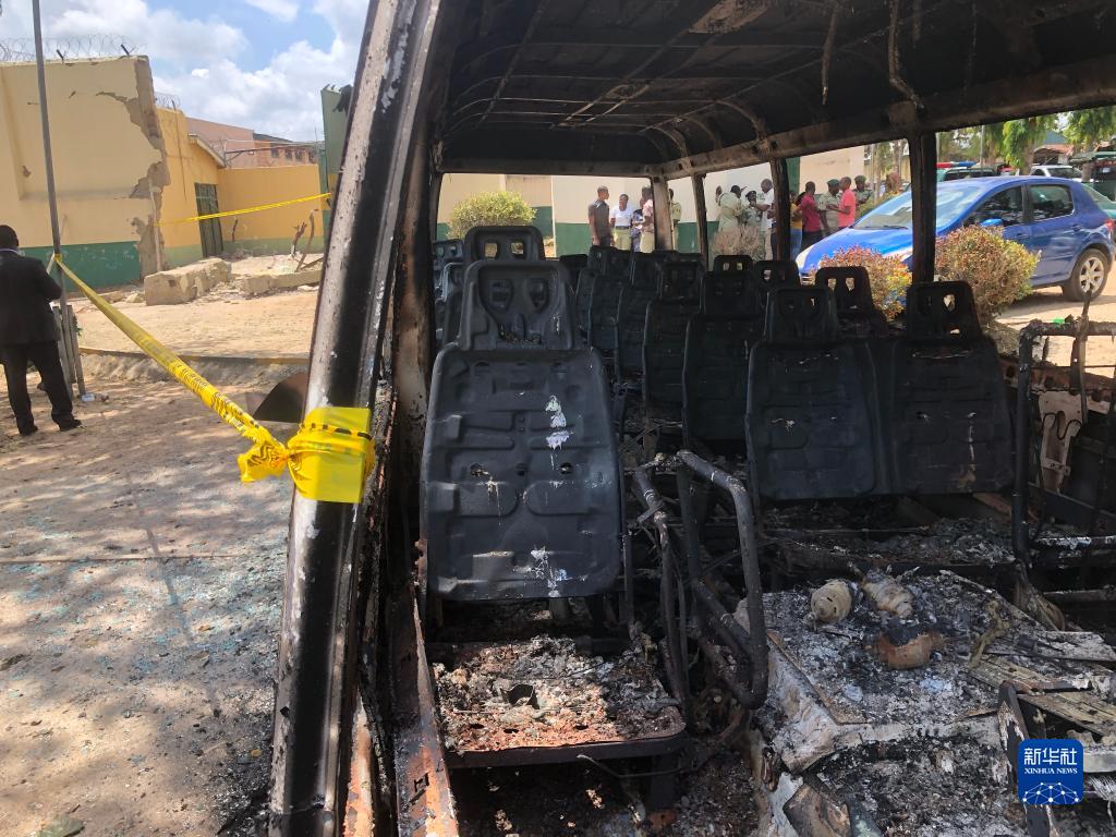 这是7月6日在尼日利亚首都阿布贾拍摄的监狱遇袭事件中遭毁坏的汽车。