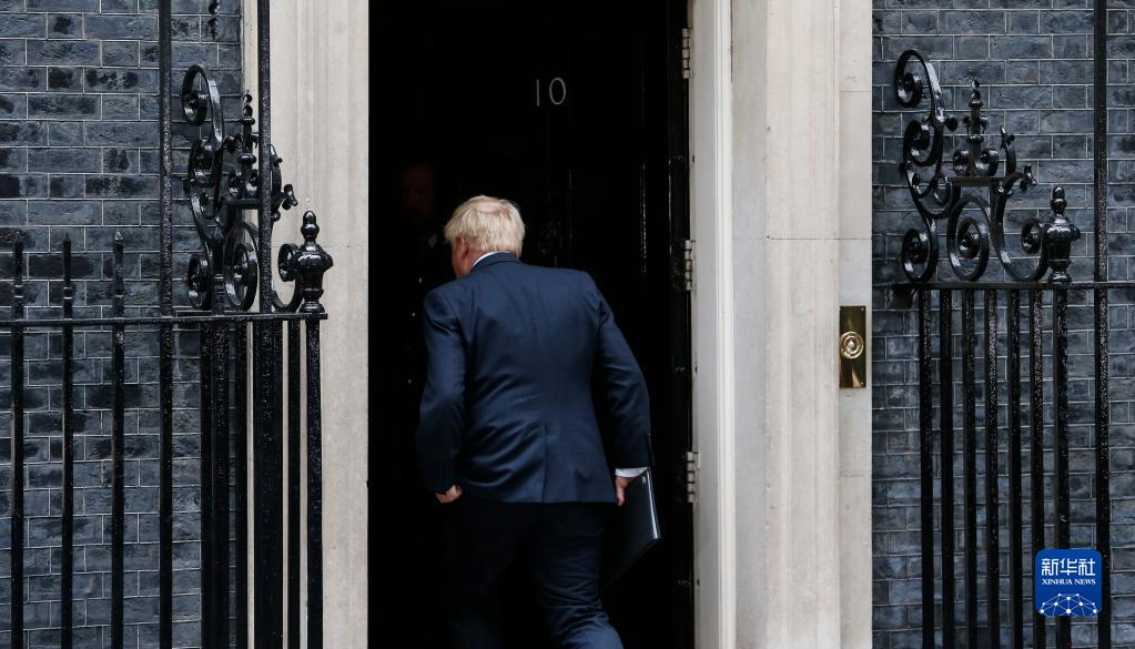 7月7日,英国首相鲍里斯·约翰逊在伦敦唐宁街10号门前发表讲话后返回室内。新华社记者 韩岩 摄