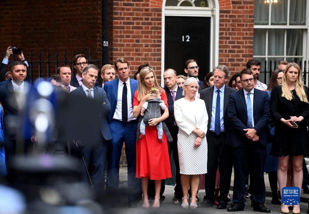 7月7日,英国首相鲍里斯·约翰逊的妻子卡丽(前排红裙者)抱着孩子观看约翰逊在伦敦唐宁街10号门前发表讲话。新华社记者 李颖 摄