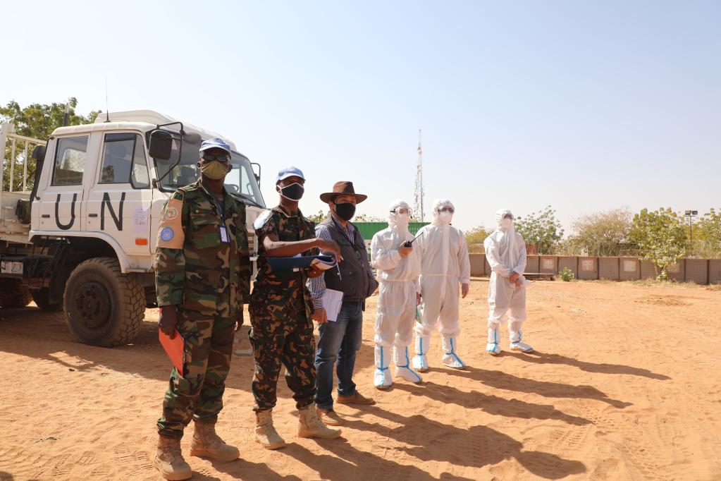 2021年3月15日,联合国和非洲联盟驻达尔富尔特派团(联非达团)核查人员查看装备性能。(新华社发,余豪 摄)