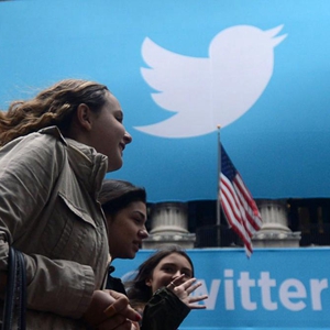 行人在纽约证券交易所悬挂着巨幅“推特”标志的大门前走过。新华社记者王雷摄