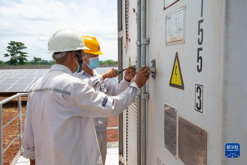 6月2日,在中非共和国首都班吉附近的宾博市,工程师在萨卡伊光伏电站检修设备。新华社记者罗毓 摄