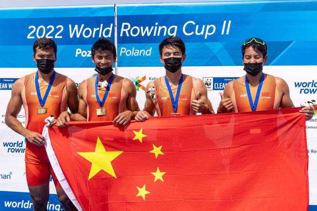 6月19日,中国选手臧哈、伊绪帝、刘治宇和阿迪里江·苏里坦(从右至左)在赛艇世界杯波兰波兹南站男子四人双桨决赛颁奖仪式上,他们获得该项目冠军。新华社发(亚斯科乌卡 摄)