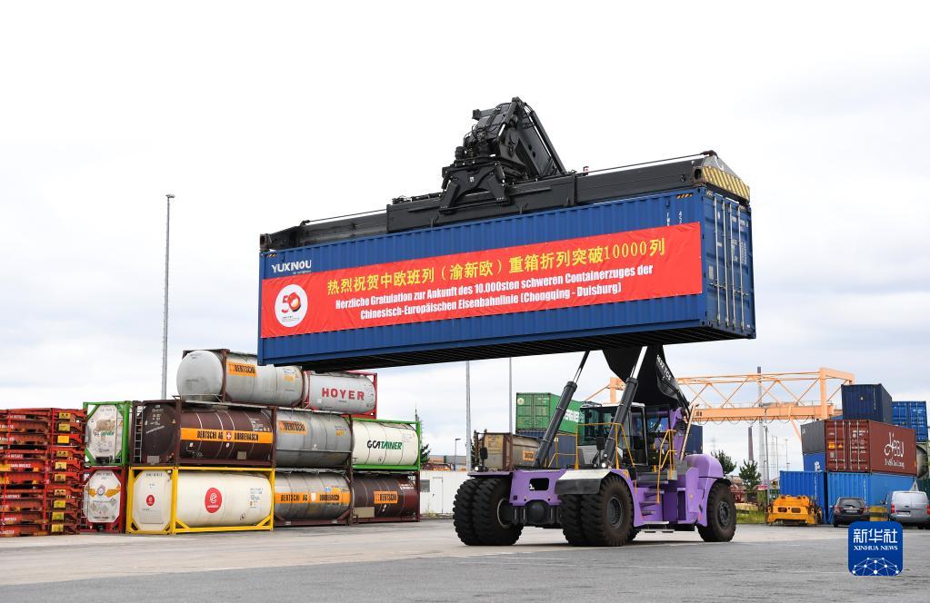新华社德国杜伊斯堡7月11日电(记者朱晟 王平平)中国首条中欧班列线路中欧班列(重庆)第10000列重箱折列接车仪式11日在德国杜伊斯堡市DIT场站举行。