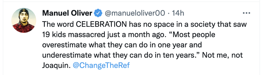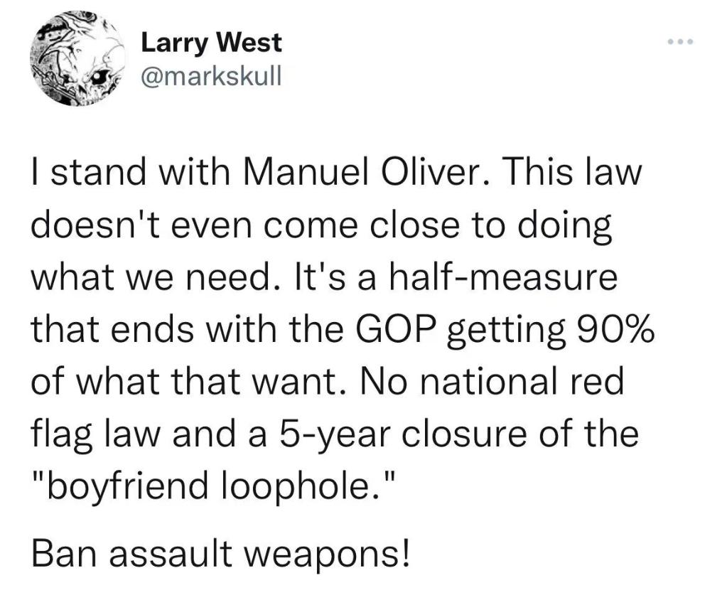 奥利弗的社交媒体账号至今仍以儿子的肖像作为头像。就在应邀出席白宫这场“庆功会”前,他在社交媒体上发文说:“美国一个多月前才发生了一场造成19个孩子遇害的枪击惨案,现在可不应该使用‘庆祝’这个词。”
