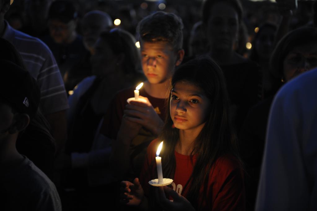 2018年2月15日,在美国佛罗里达州帕克兰市,人们手举蜡烛参加为悼念校园枪击案遇难者举行的守夜活动。新华社记者刘阳摄