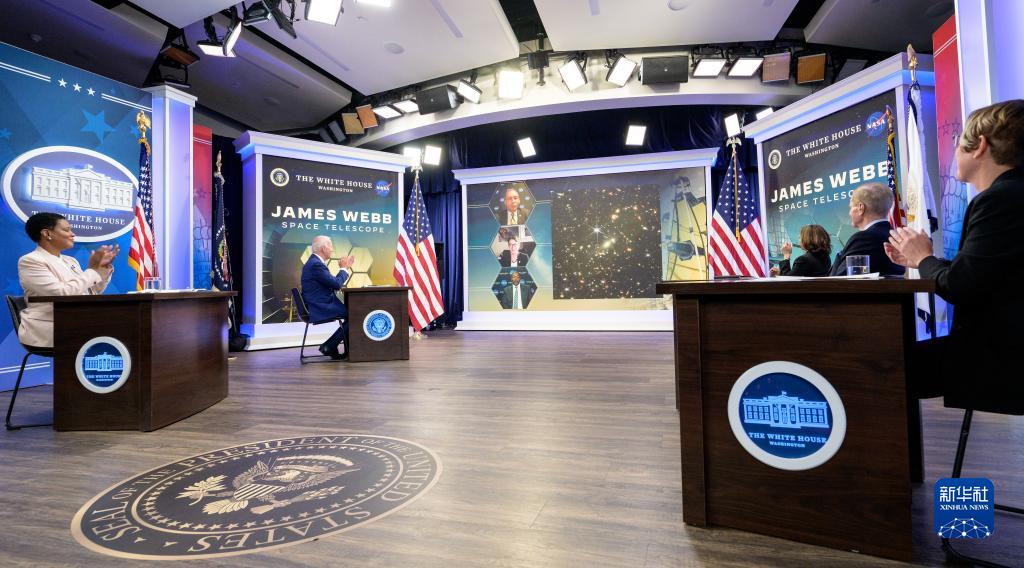 这是7月11日在美国华盛顿白宫拍摄的詹姆斯·韦布空间望远镜照片公布报告会现场。新华社发(美国航天局供图)
