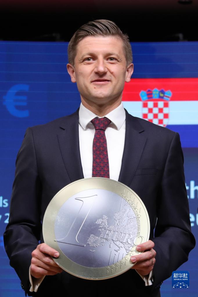 7月12日,在比利时布鲁塞尔举行的克罗地亚加入欧元区法律文件签署仪式上,克罗地亚副总理兼财政部长兹德拉夫科·马里奇手持象征性的“欧元硬币”。新华社记者郑焕松摄