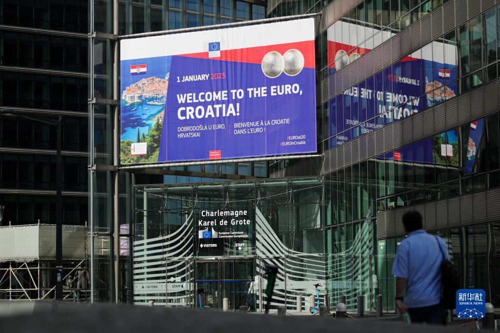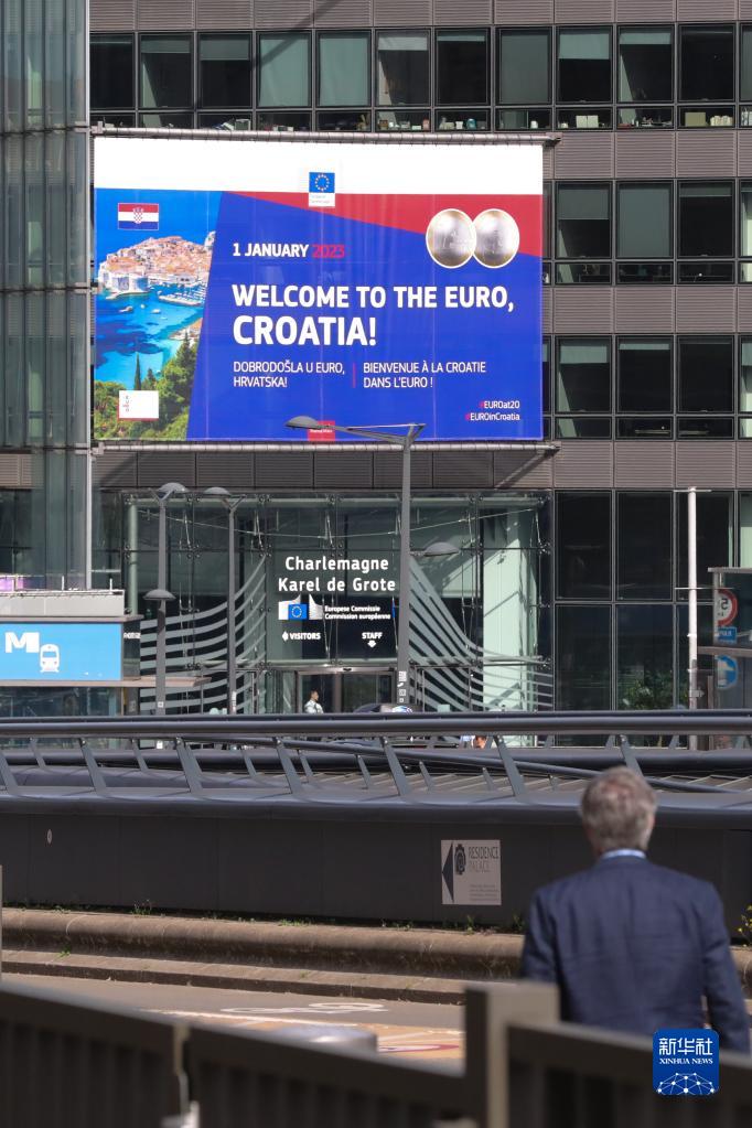 7月12日,在比利时布鲁塞尔,行人经过“欢迎克罗地亚加入欧元区”海报。新华社记者郑焕松摄