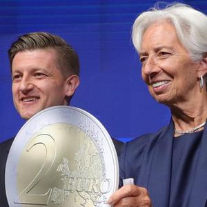 7月12日,克罗地亚副总理兼财政部长兹德拉夫科·马里奇(左)与欧洲央行行长拉加德在比利时布鲁塞尔出席克罗地亚加入欧元区法律文件签署仪式。新华社记者郑焕松摄