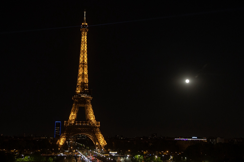 ↑“超级月亮”现身法国巴黎埃菲尔铁塔上空。新华社发(奥雷利安·莫里萨尔摄)