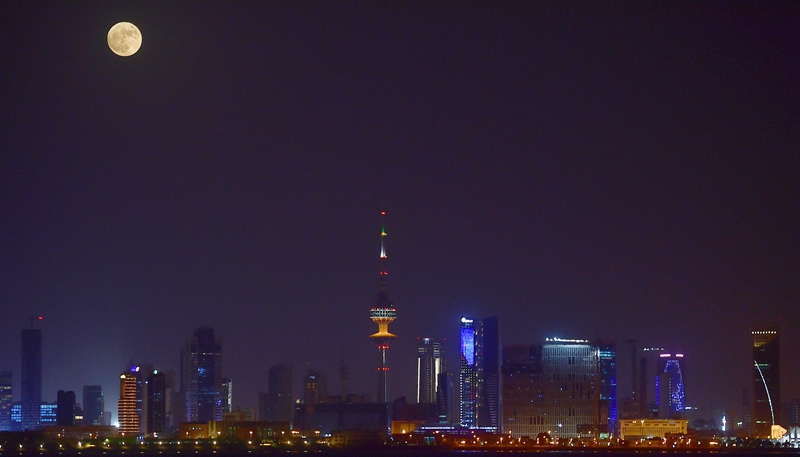 ↑“超级月亮”现身科威特首都科威特城夜空。新华社记者 尹炣 摄