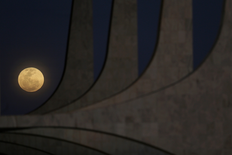 ↑“超级月亮”现身巴西首都巴西利亚的总统府上空。新华社发(卢西奥·塔沃拉摄)