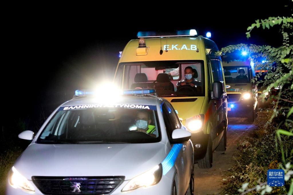 7月17日凌晨,在希腊北部城市卡瓦拉附近,警车与救护车前往坠机地点。