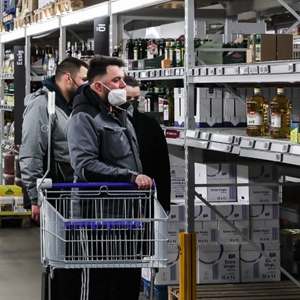 3月26日,在德国首都柏林的一家超市,顾客站在商品短缺的食用油货架前。新华社记者单宇琦摄
