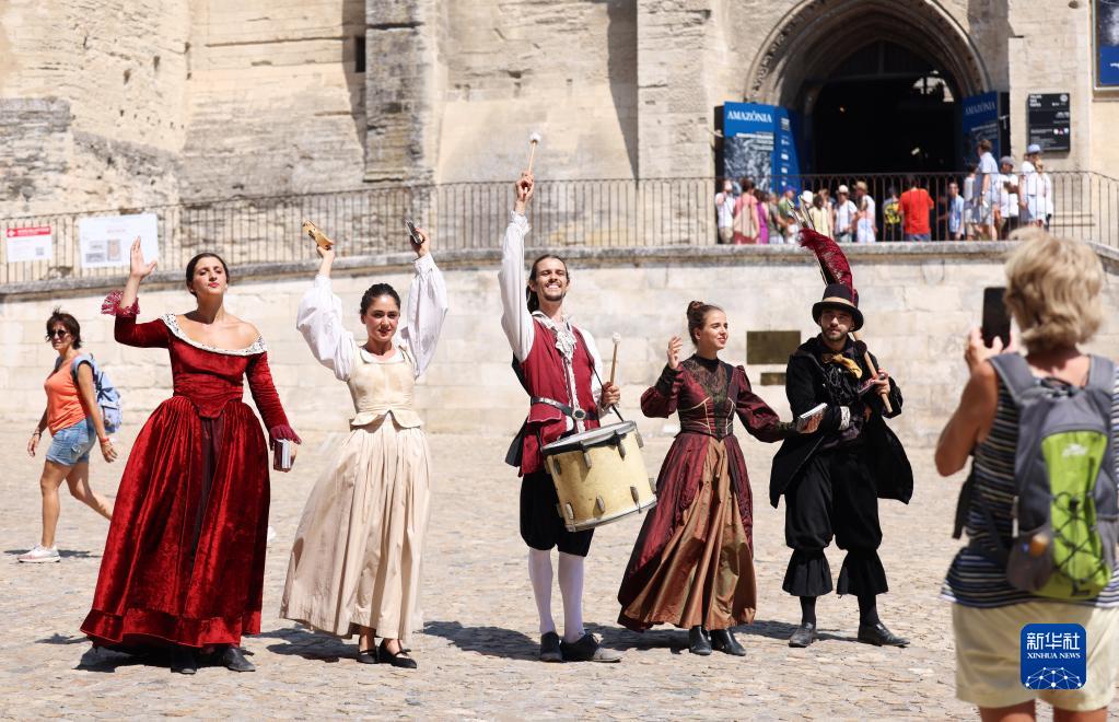 7月19日,在法国南部城市阿维尼翁,演员身着戏服在教皇宫前推介自己的剧目。