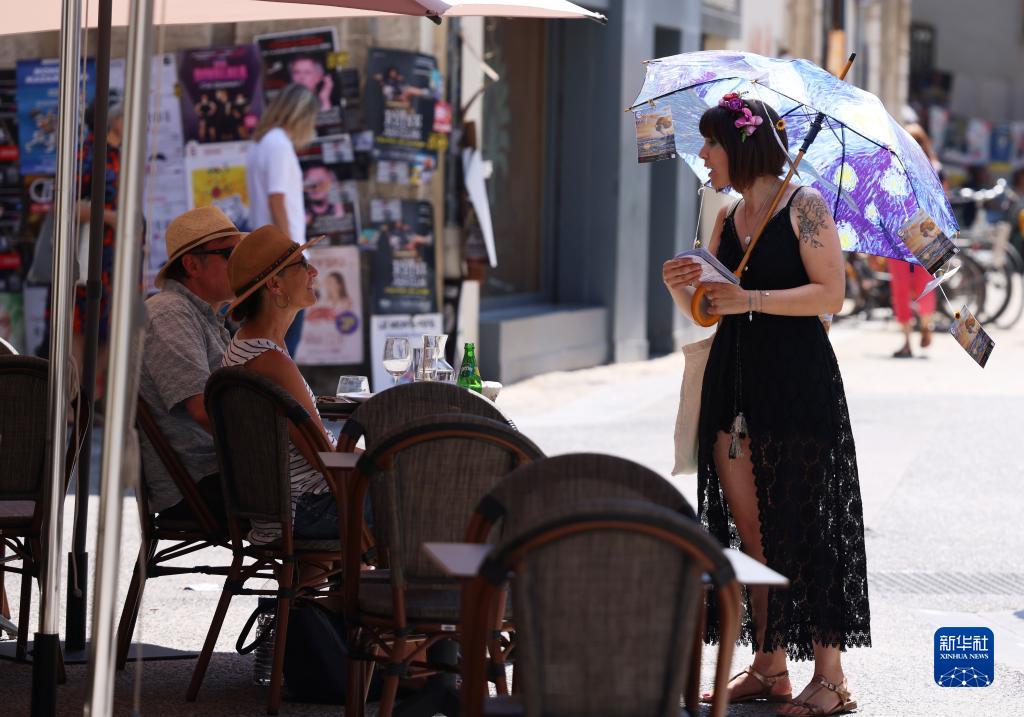 7月19日,在法国南部城市阿维尼翁,一名演员(右)在街头向人们推荐剧目。