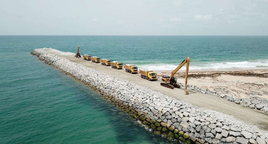 这是2018年3月29日在尼日利亚拉各斯州莱基深水港拍摄的防波堤。莱基深水港一期投资建设两个集装箱泊位。一期工程由中国港湾承建。新华社发(蒋新彤摄)