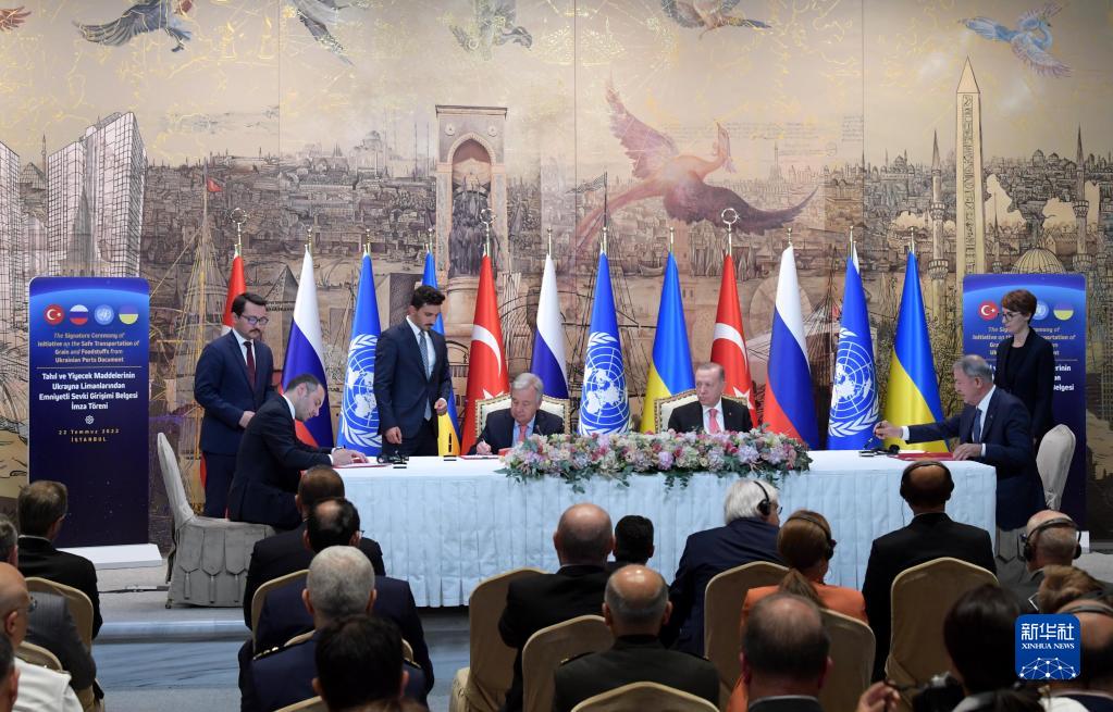 当日,土耳其、俄罗斯、乌克兰和联合国代表在土耳其最大城市伊斯坦布尔就从黑海港口外运农产品问题举行签署协议仪式。