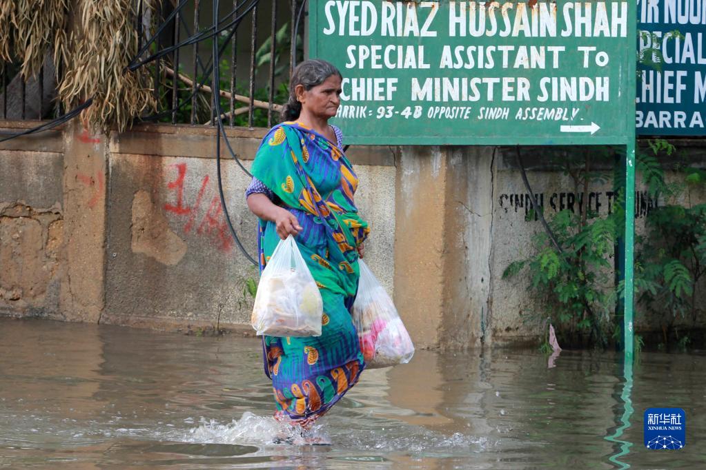 7月25日,一名女子涉水经过巴基斯坦卡拉奇一条被积水淹没的道路。