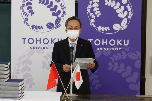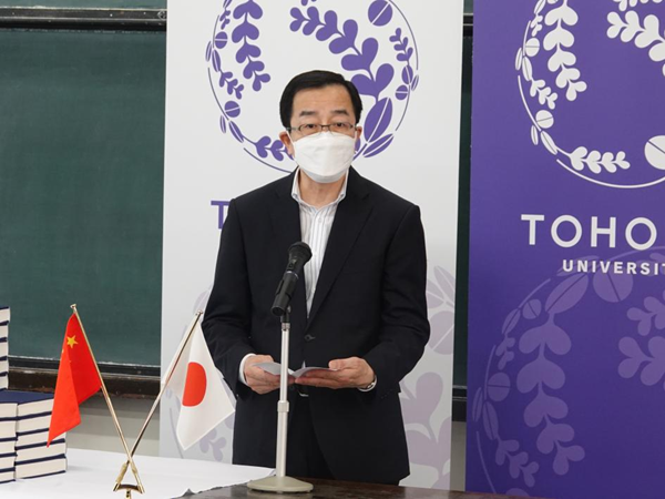 7月26日,日本东北大学校长大野英男在捐赠仪式上发表致辞。(中国驻新潟总领馆供图)