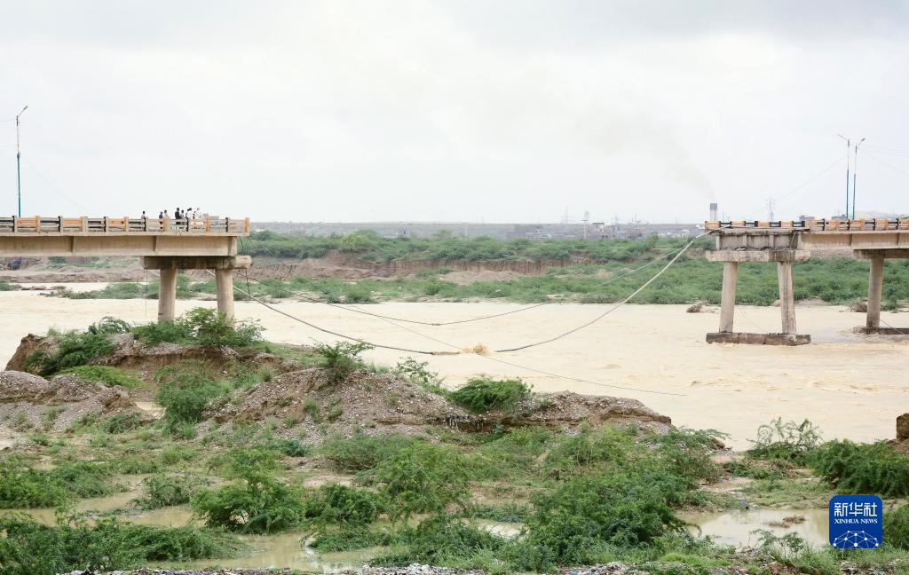 这是7月26日在巴基斯坦卡拉奇拍摄的在洪水中损毁的桥梁。